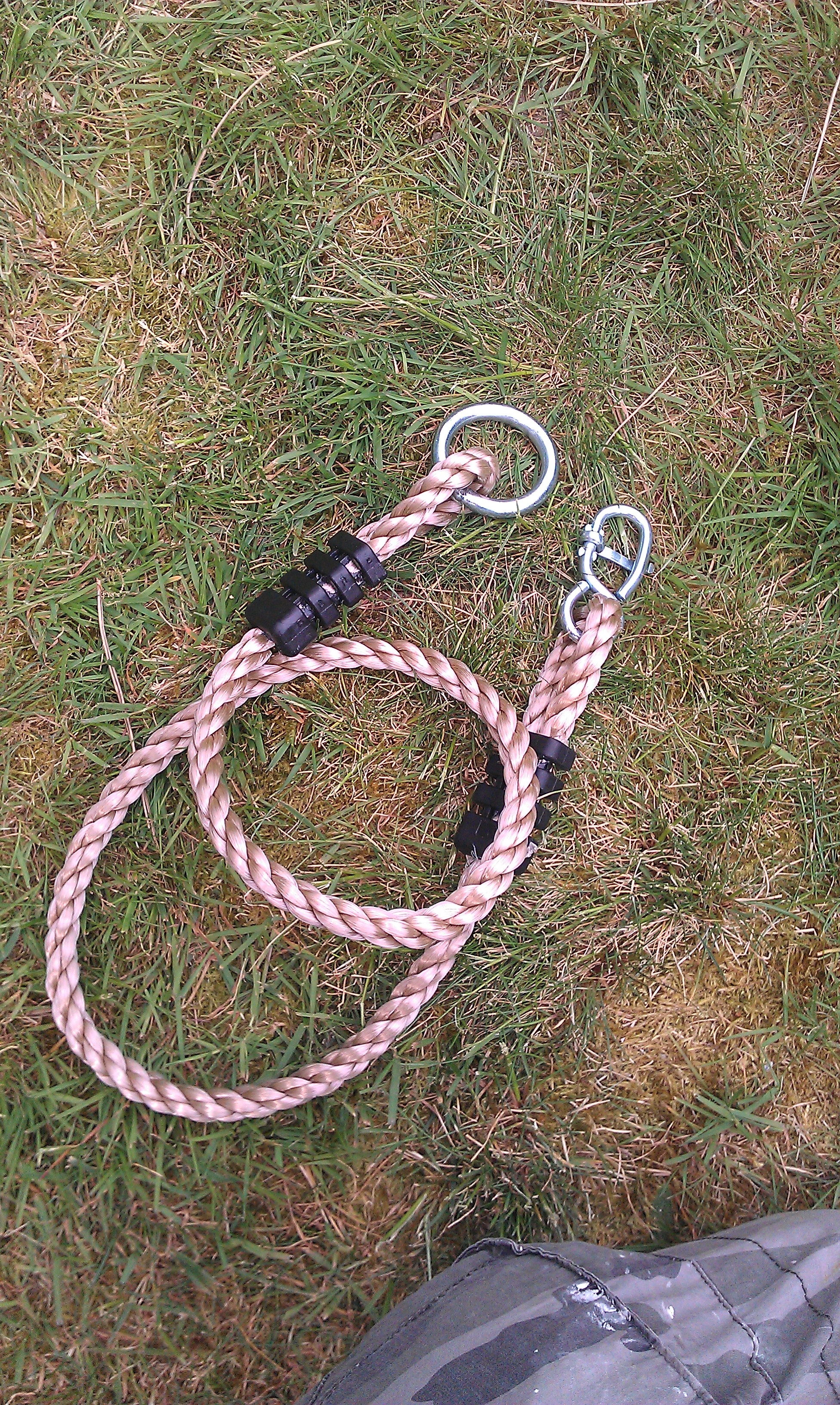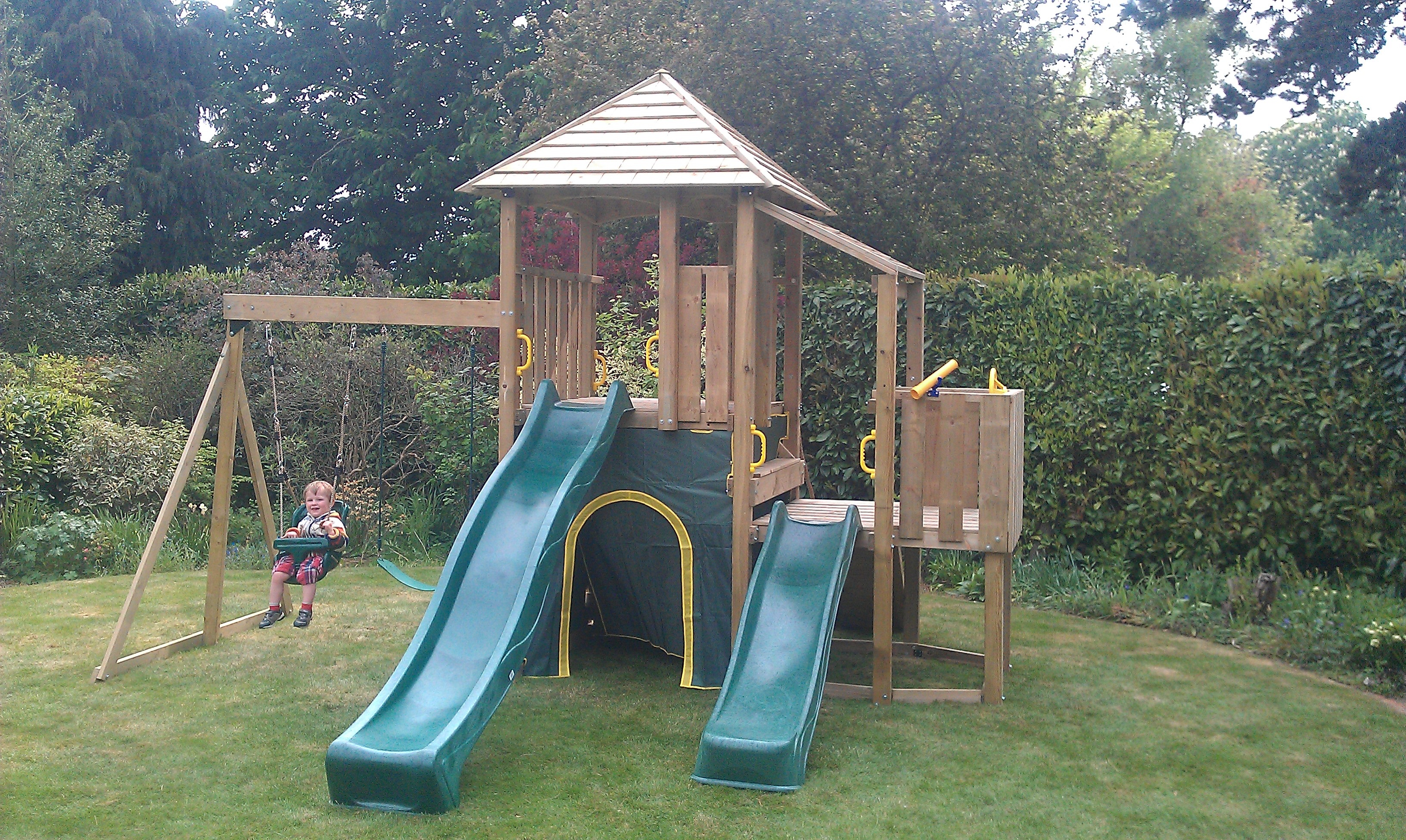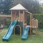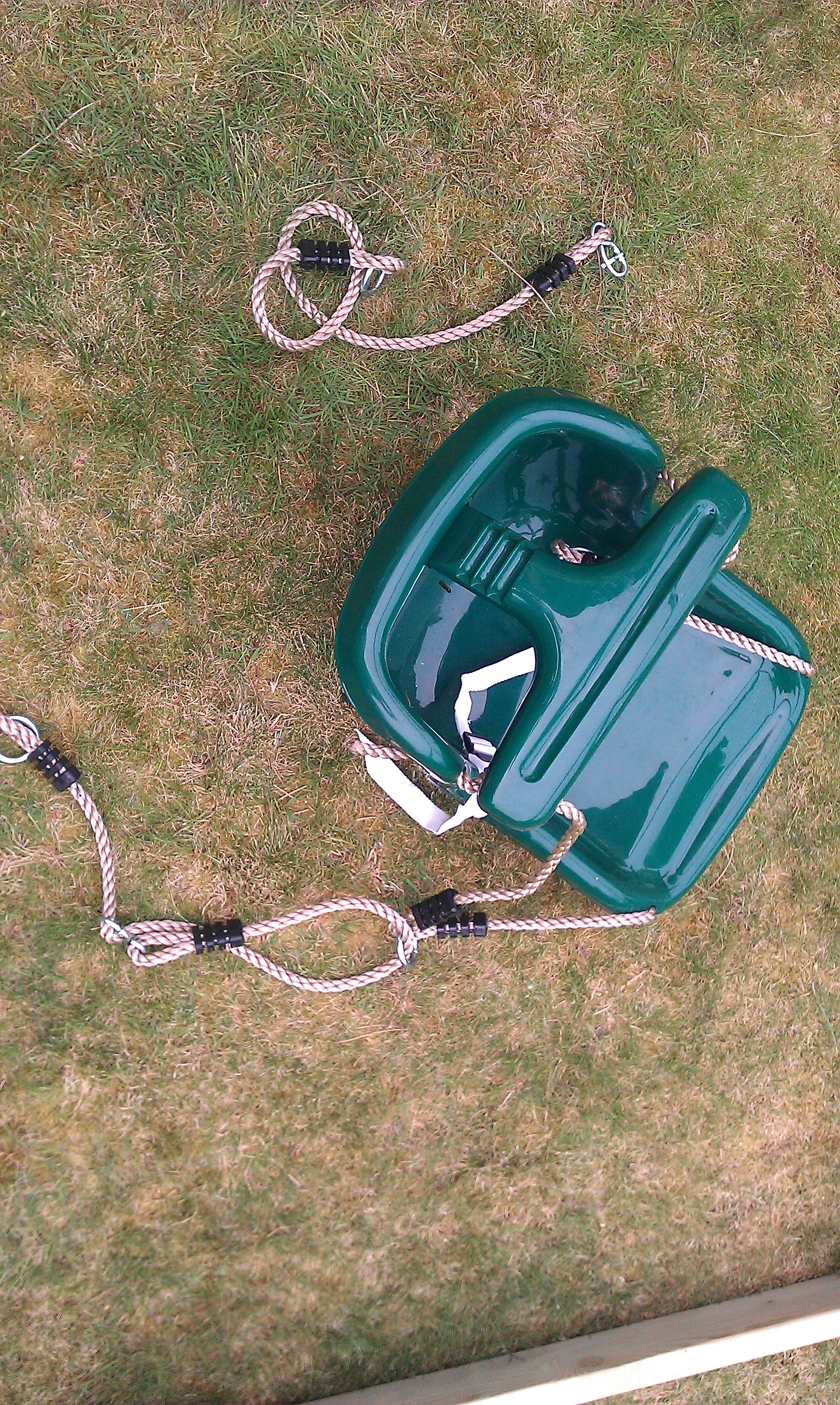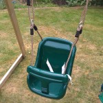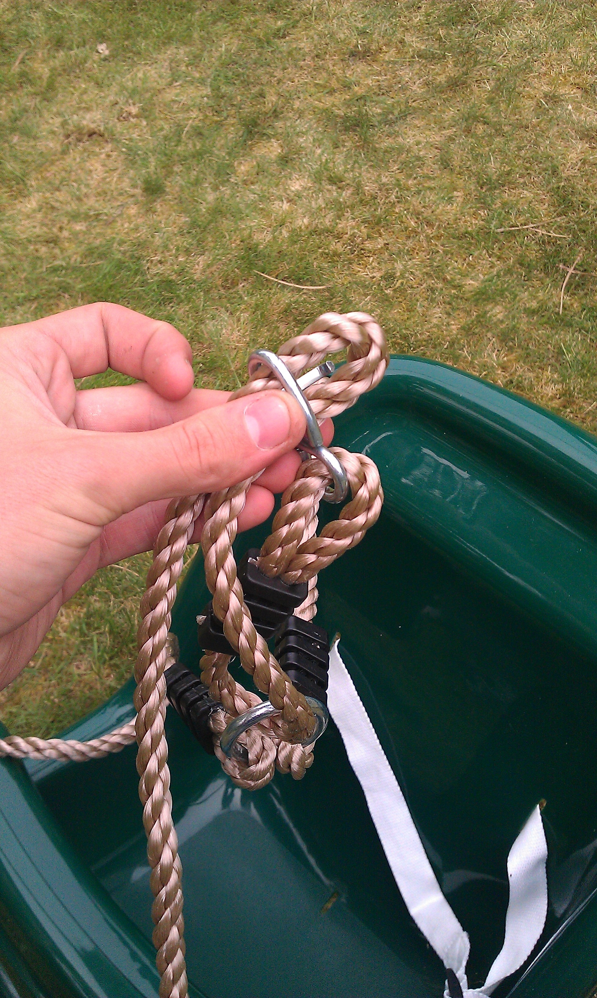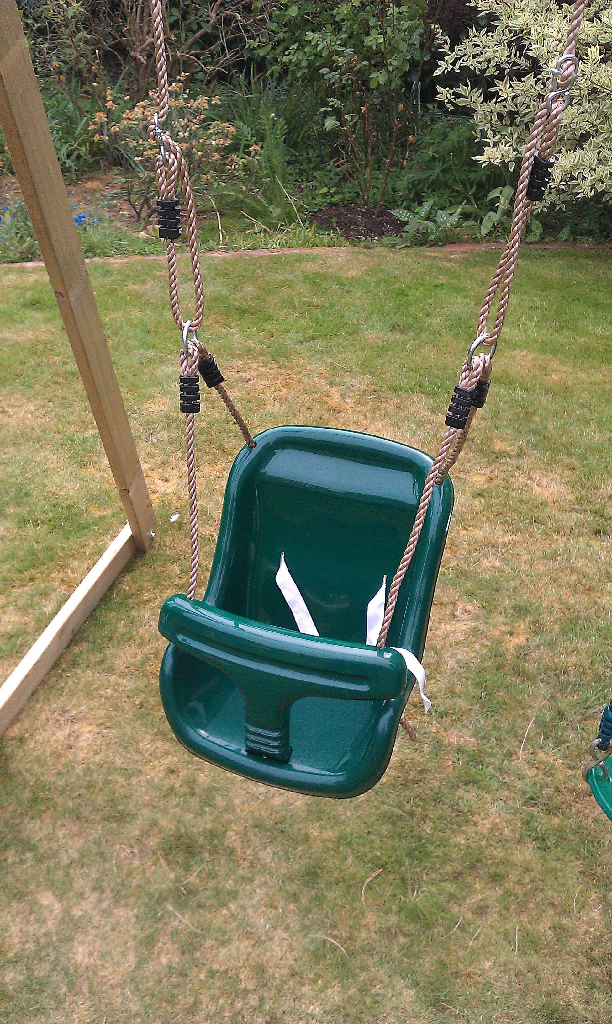 To adjust it push the rope through the hinge until slack and then lower or high each side to make the seat level. Be aware the seats rope could be twisted so adjustment could be made again in future. This should not swing within 30cms from uprights of the climbing frame or other swings to allow a safe distance to swing.