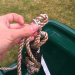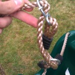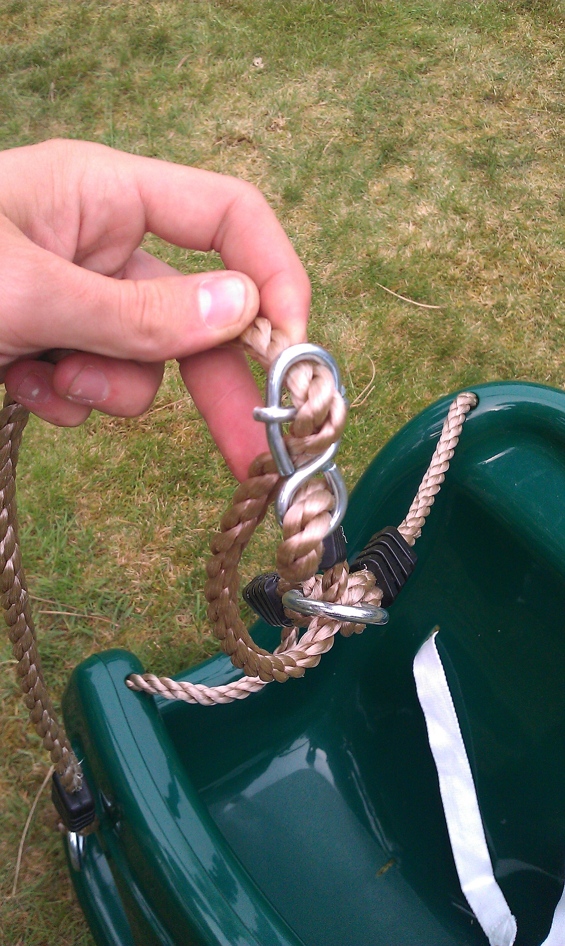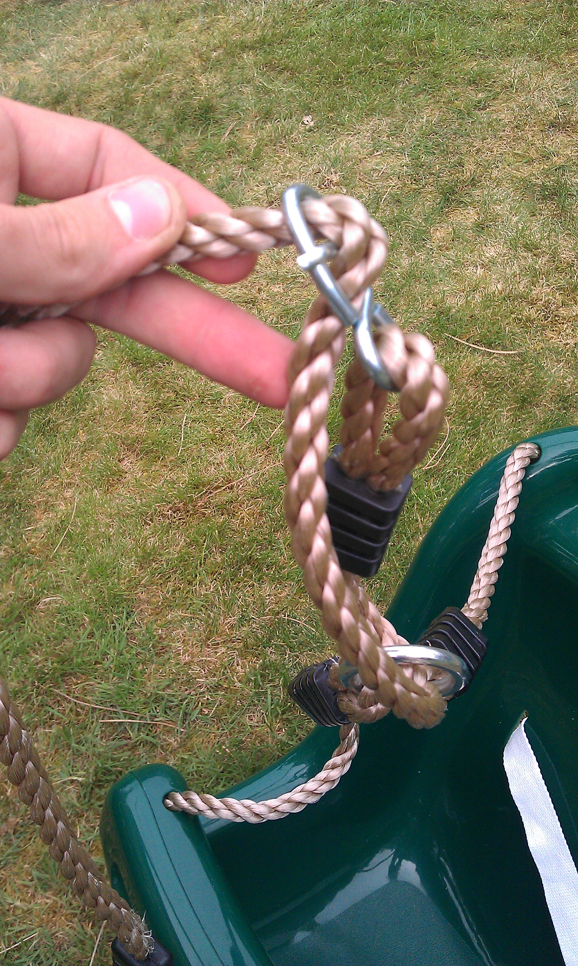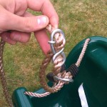 Loop the rope single section through the whole joining the swing seat, push it through the connector to form a hole and push the metal hinge through the middle of this hole. This will lock when pulled tightly. Do the same for the other side of the baby swing seat and its hanging.