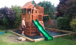 When you’re building your play pit its best to measure it correctly. It’s very common that we will attend to build your climbing frame, in this instance a Selwood Skyfort. Building your playset in a pit like this is fine, build the pit or structure and lay the underlay. If you can pin this into the ground then it will stop the underlay from moving whilst we install your climbing frame. The measurements on many website show the size of the play sets, you then need to allow “play space” to climb onto the ladders, monkey bars and most importantly allowing space at the end of your slide.