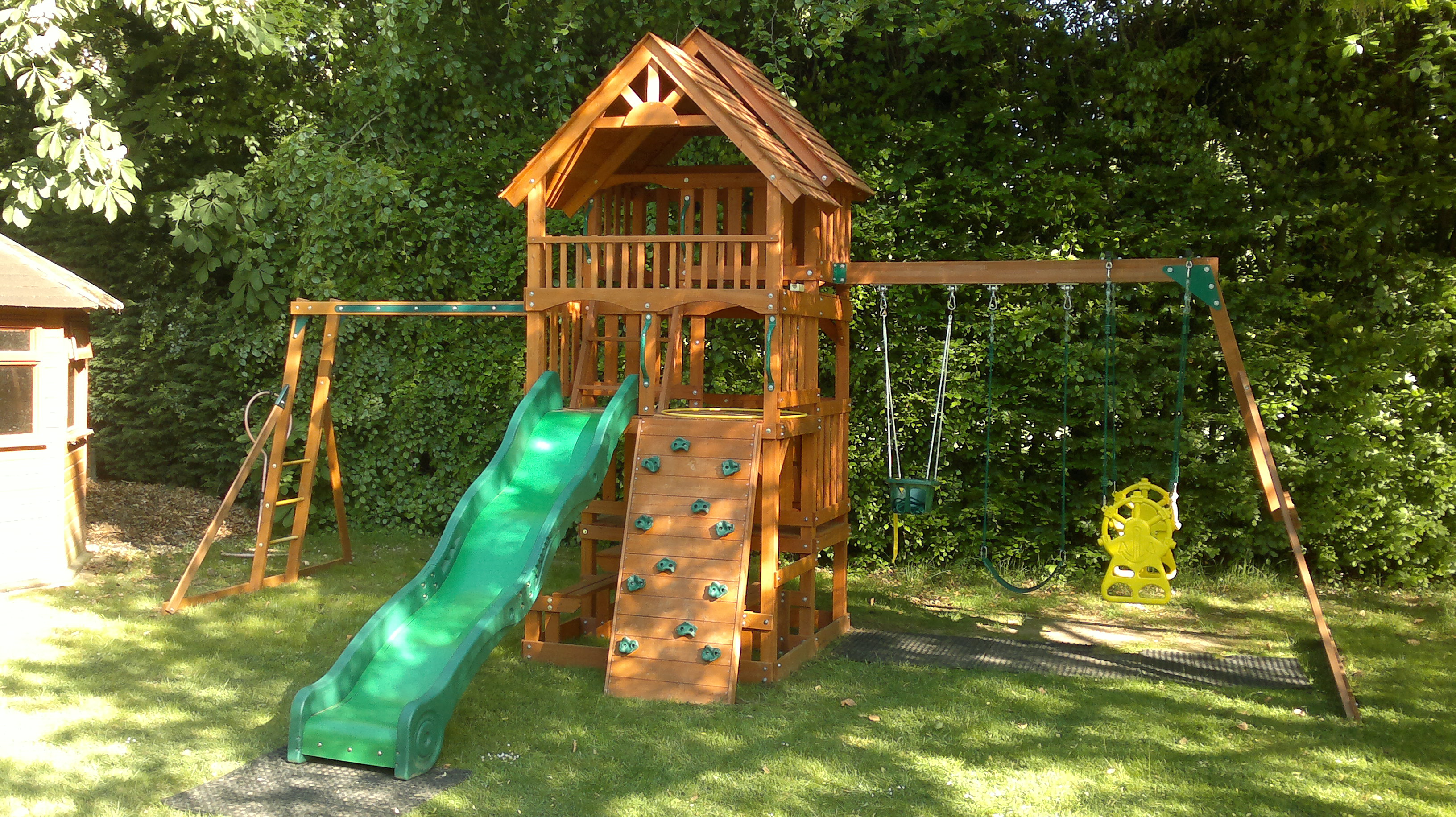 The Highlander supports a steps at the back, rockwall, slide, swings, double seat glider swing and monkey bars. The wooden garden climbing frame is over 3.9m tall. Our climbing frame installers travel all over England. We are your local professional playset builders. so fill in the quick quote form now.