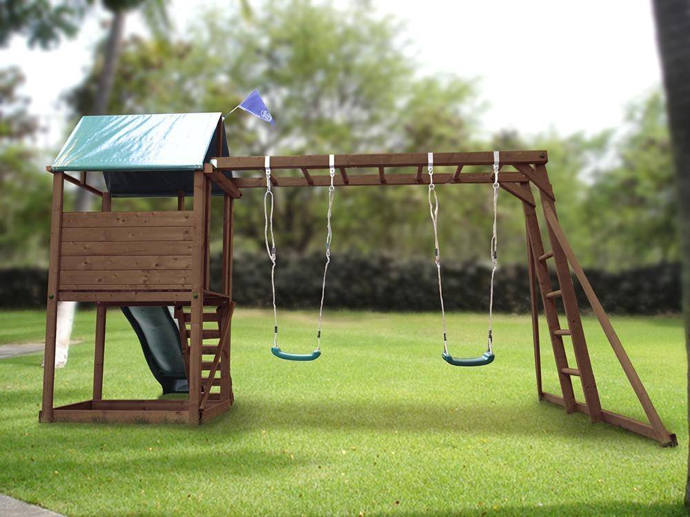 The SquirrelFort playset from Dunster House is designed with medium to large sized gardens in mind as it includes a spacious wooden play fort as