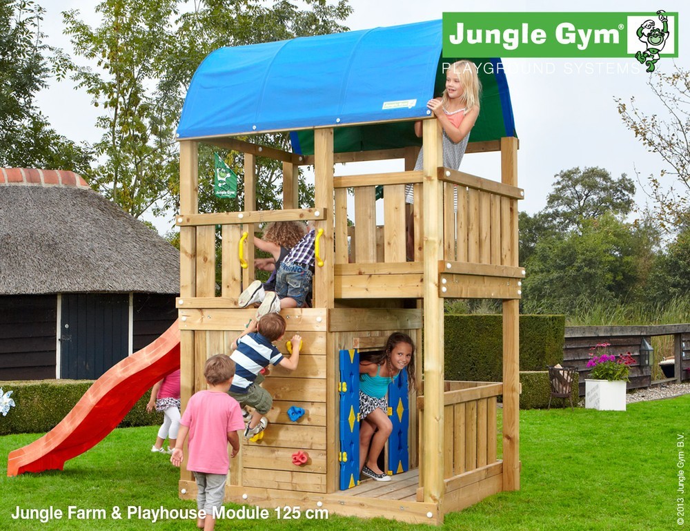 The Farm Playhouse climbing frame from Jungle Gym is a fun-filled children’s play frame packed with character and lots of popular climbing frame accessories. The Farm Playhouse 2 Swing playset features a large wooden play fort with everything from railed play decks to a rockwall, an enclosed playhouse, porch area, a climbing ladder, room for a sandbox plus a swing set and slide.