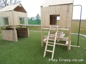 Underneath the play deck in the second play tower is an enclosed lower play cabin with a small gap around the top to let light in and for children to peep out of, plus a gap at the front for children to get in and out of the play cabin. The playhouse is spacious enough so several children can play together at once plus it makes for a great place to keep other outdoor toys in and stop them from cluttering up the garden.
