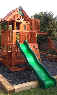 Many people have different views on which safety flooring is best, and barriers used to enclose some safety surfaces can add an extra obstacle for children to fall over when running around the play frame but also are not nice to fall onto. The advantage of using wood chippings or bark is that it is a natural material however it will need to be regularly topped up. Also, loose chippings used as a safety flooring will get dragged across your garden and can get everywhere, in shoes and clothing etc. so can be a messy flooring to have installed.