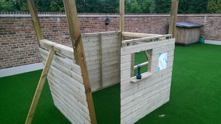 For example, pictured here is an enclosed lower play cabin being built. The play towers featured in Play Crazy climbing frames can be designed to include an enclosed playhouse beneath the play deck, a partially enclosed play house or even something completely different such as a picnic table or it can be left as an open space for kids to play in or keep outdoor toys in one place.