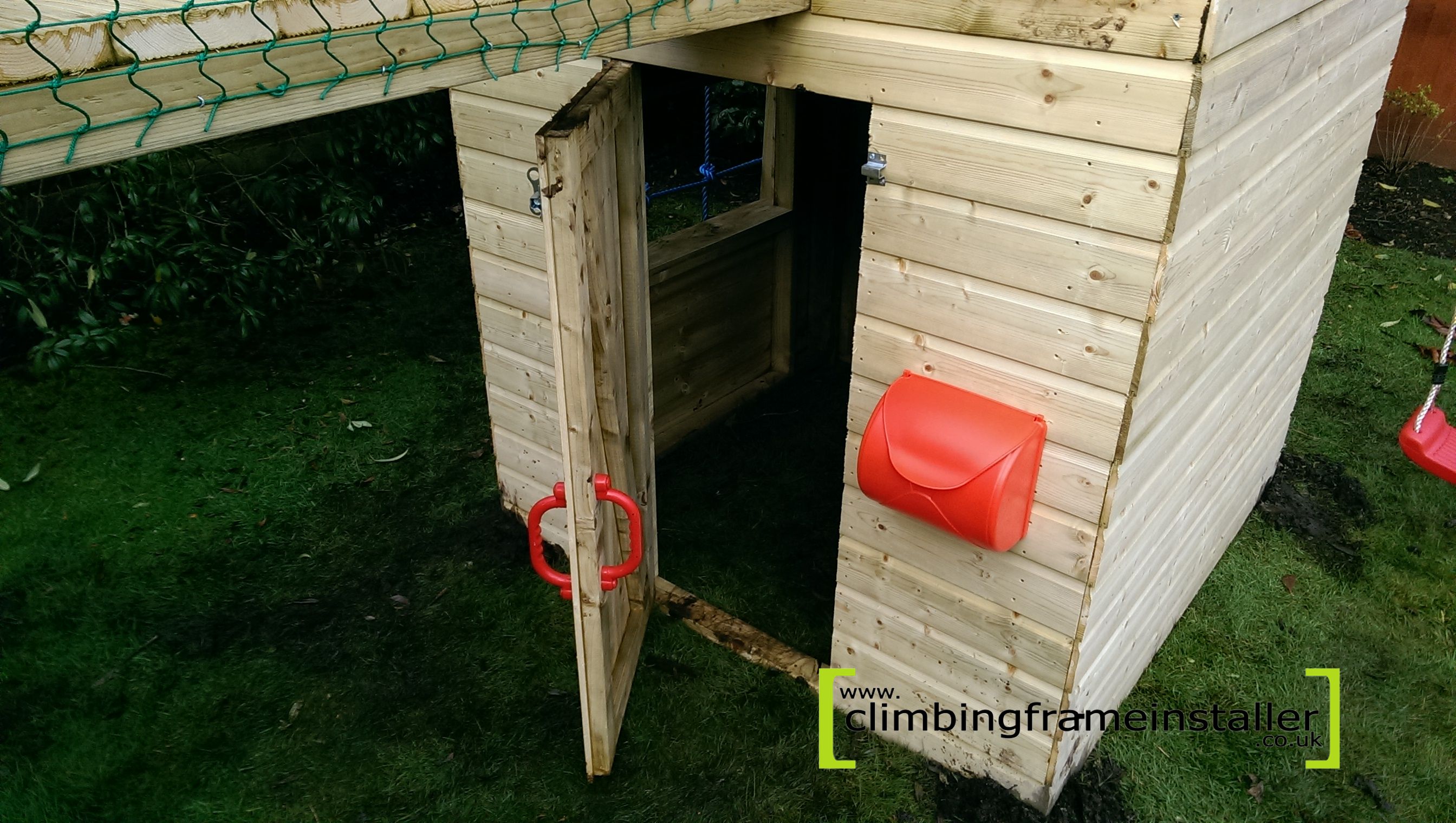 The second play tower also features a railed play deck which children can climb to using the cargo net at the back of the climbing frame or by climbing across the bridge from the other play deck. The second play tower also features a lower enclosed playhouse beneath the play deck which kids will love. The playhouse includes a door underneath the bridge which can be opened and clos ed. Kids will love having their very own playhouse to play in. It is spacious and sheltered so makes a great play cabin.