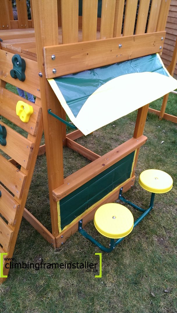 The opposite side of the play fort includes a picnic bar and stools on the lower part of the play tower. The picnic area provides children with a place to rest between play, have a drink or snack and it even inspired fun games. The picnic seats are a handy accessory which also provide this climbing frame with some character.