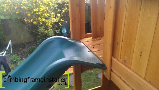 The only issue with assembling the Hartley climbing frame is the slide which features at the front of the play tower. The slide is a fantastic way for kids to exit the play deck and enjoy a fun ride down from the upper playhouse. However there are a few issues with installing the slide that comes with the Hartley as the picture shows. The slide is wider than the gap intended for it, although our experienced climbing frame installers have no problem remedying this for you.